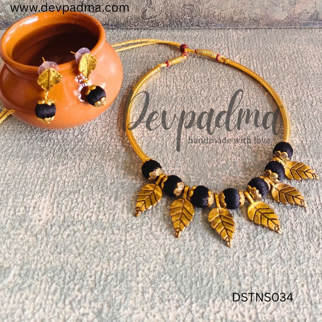 Handcrafted Silk Thread Choker Necklace Set with Leaf Design – Black & Gold