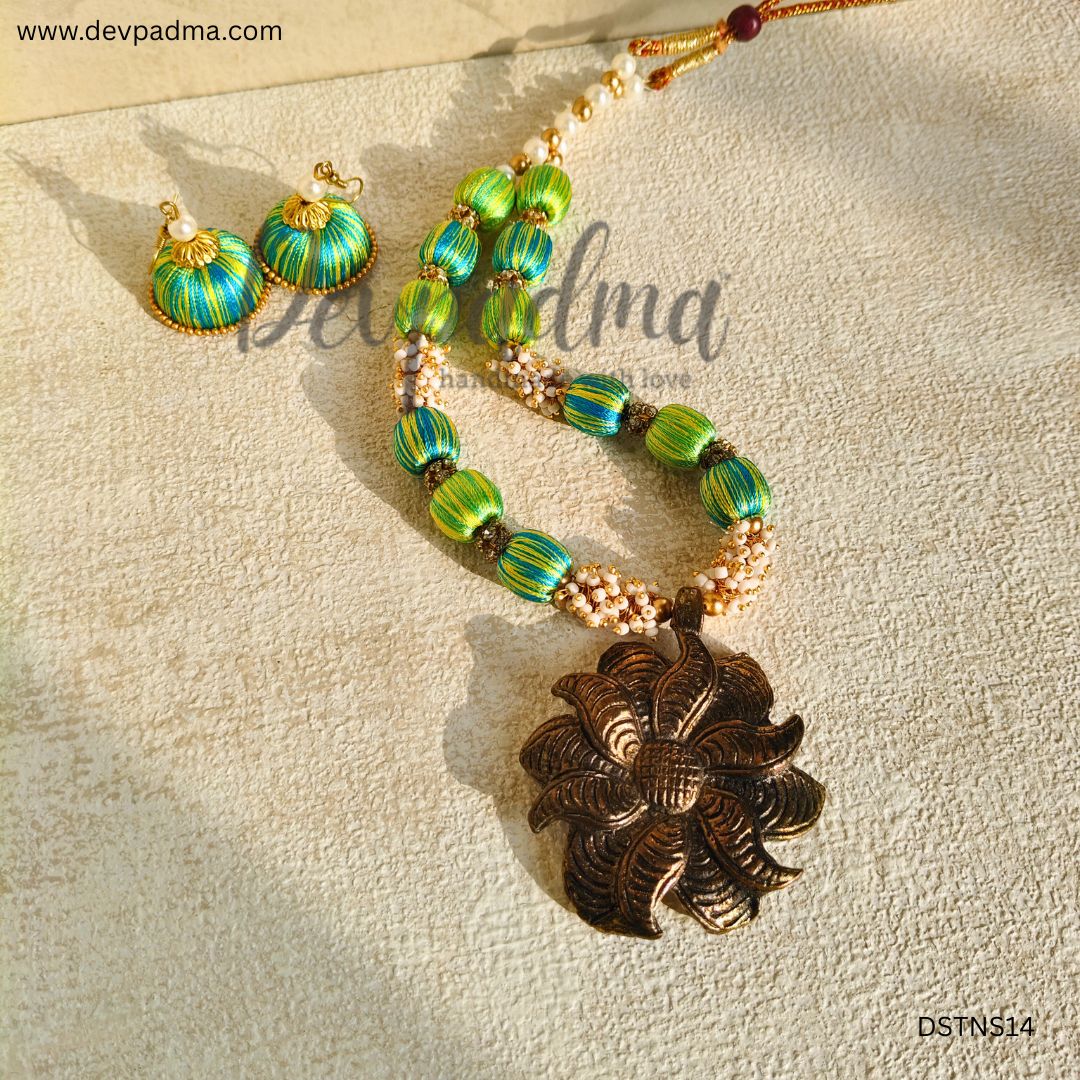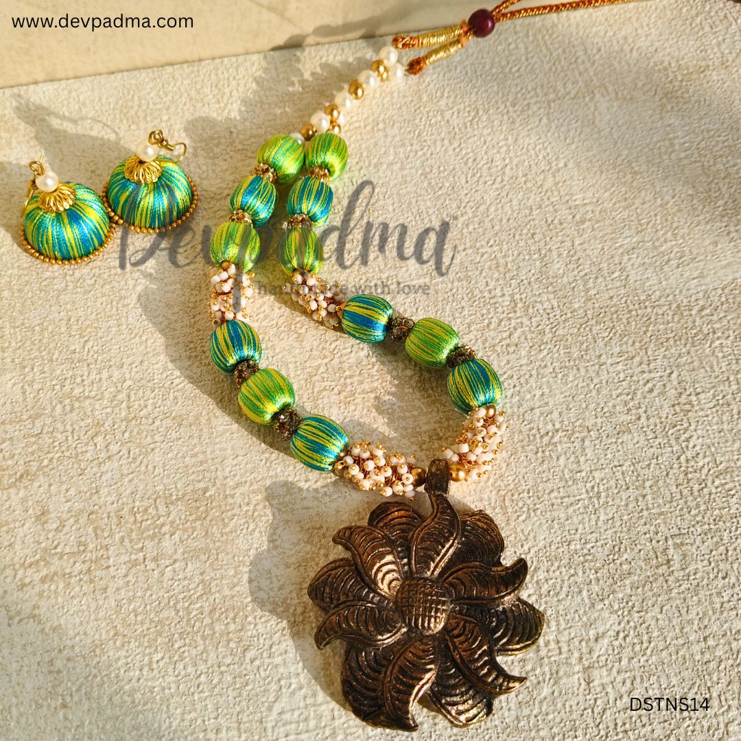 Unleash your colorful side with this Light Green & Blue Silk Thread Necklace Set, beautifully handcrafted with love and precision. The set includes a stunning necklace featuring a large ethnic brass-plated floral pendant and matching jhumka earrings. Whether you’re dressing for a festive celebration or a traditional ceremony, this set is sure to make a vibrant statement.