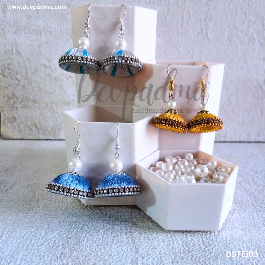 Elevate your traditional and festive look with this vibrant set of 3 handcrafted silk thread jhumka earrings from DevPadma. Each pair is uniquely designed with elegant beadwork and finished with pearl tops, perfect for everyday ethnic wear or special occasions.